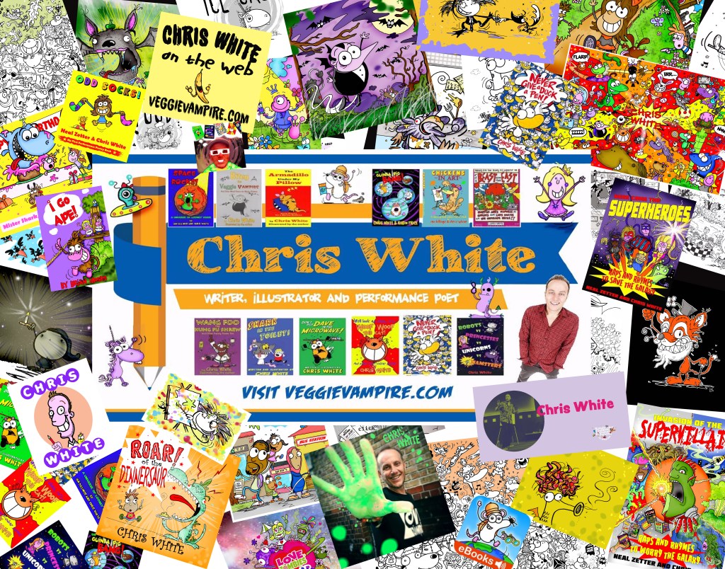 It was in the year 2000 that Chris was lucky enough to have his first collection of poems published. It was called Bitey the Veggie Vampire, and since then he hasn’t looked back. Many other books of poetry, stories and scribbles have been published since that day. But that is only one part of the story, as Chris was asked to perform at a few book festivals to promote his debut book. Never having read his poems to an audience before, Chris was very nervous but he did his best…and it all turned out ok. Phew!